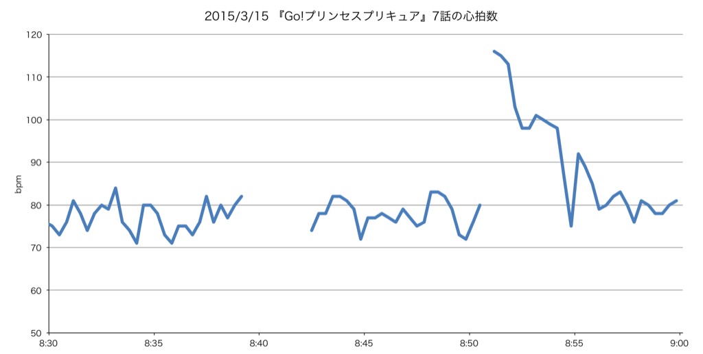 1位は『キラキラ☆プリキュアアラモード』からスーパー転校生爆誕回。心拍数をグラフ化したものが以下である。
